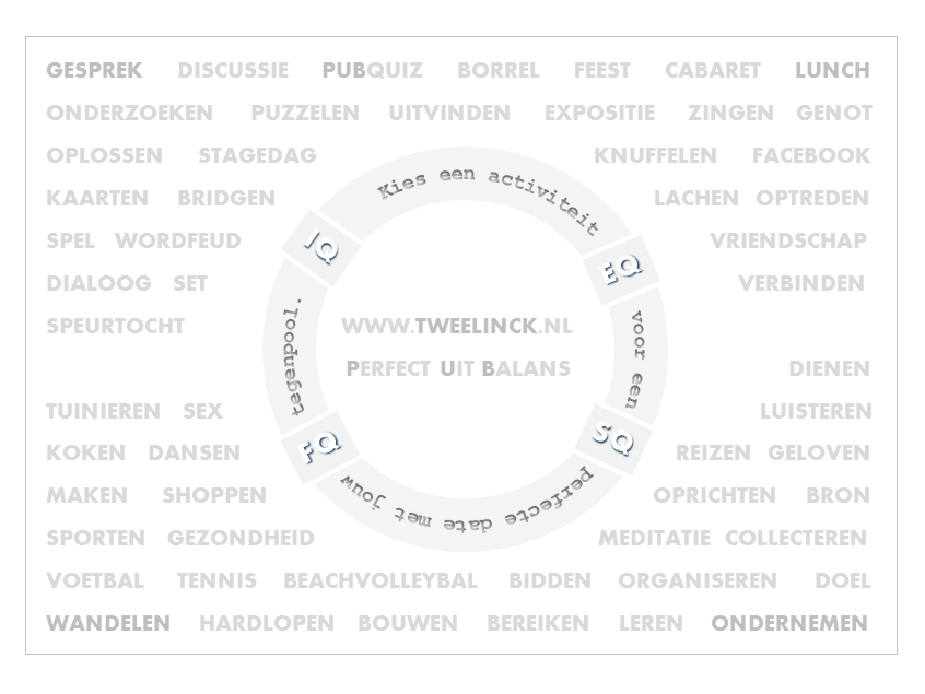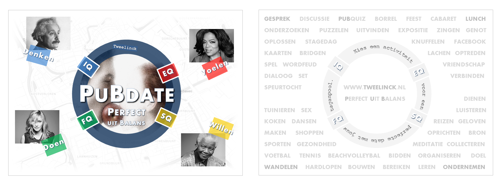 Een PuBdate is een afspraak voor een update van een bestaande werkrelatie. Samenwerken met sommigen gaat makkelijker dan met anderen. Voor alle werkrelaties geldt dat we naar verloop van tijd wel denken te weten wat we aan elkaar hebben. De [PuBdate] is een impuls om samen nieuwe mogelijkheden te onderzoeken. Prik een datum en tijdstip en gebruik de kaart om een inspirende invulling te geven. Download het PNG-bestand. De PuBtest is een onderdeel van de Perfect uit Balans training.